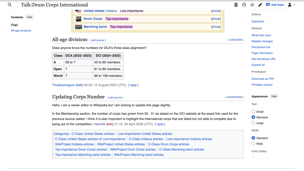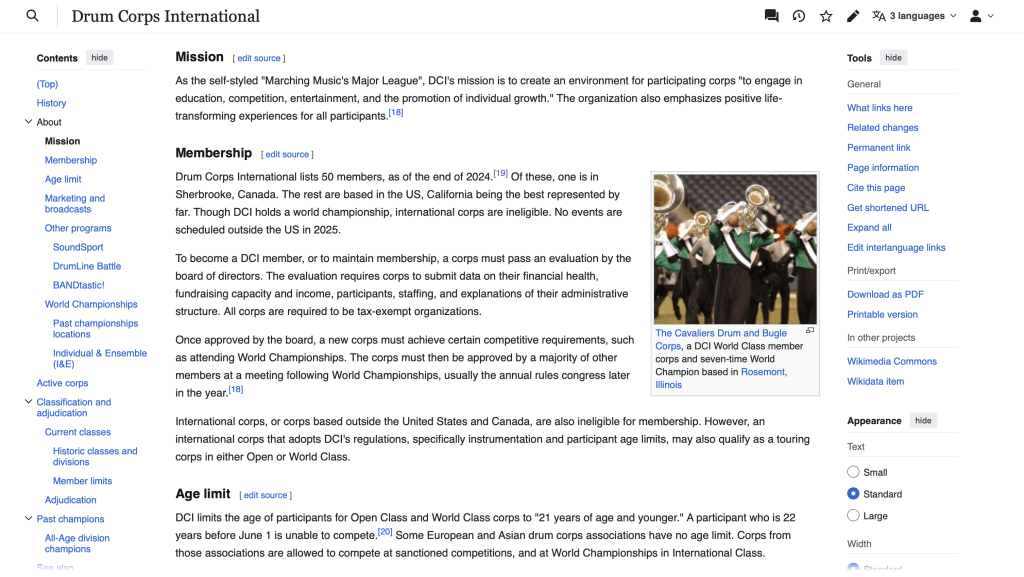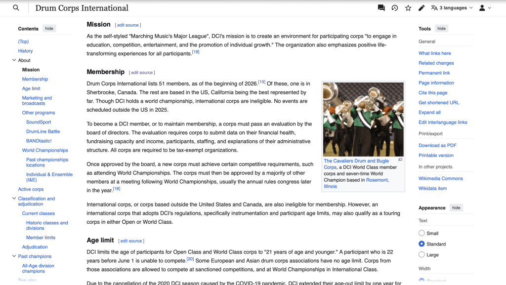 For this MCO426 assignment, I had the opportunity to move from being an avid reader of Wikipedia to actually participating in the editing process. The article I chose to work on was the page for Drum Corps International, an organization I am familiar with and have spent much of my life involved with.